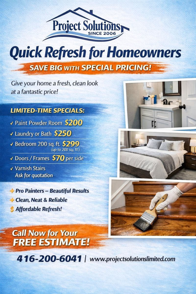 Since 2006, Project Solutions Limited has been painting and staining homes, condos, and offices across the Greater Toronto Area. To date, we have painted or stained over 20,000 homes and thousands of condo suites in the GTA, including staining and varnishing of staircases, We HAVE PERFECTED THE ART OF refinishing staircases in two-tone color in order to modernize with today's decor and flooring colors. We renovate bathrooms and quote as "Labor Only" so you can enjoy the freedom of selecting finishes according to your tastes and budget. We provide color consulting, if required, and use only Benjamin Moore Paints. We provide a one-year warranty on all our installations. We have a team that includes, plumbing/electrical/carpentry and handyman services. We enjoy a high rating on HomeStars and we have rave reviews can provide references upon request.